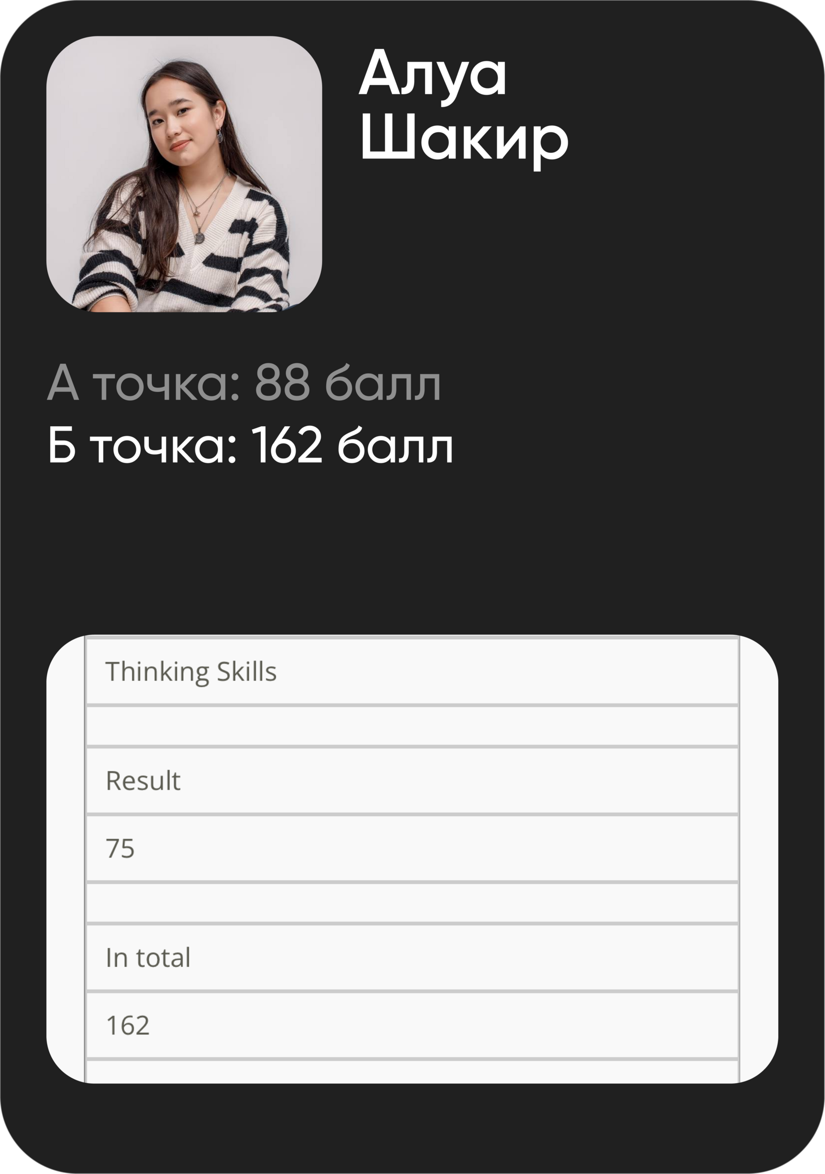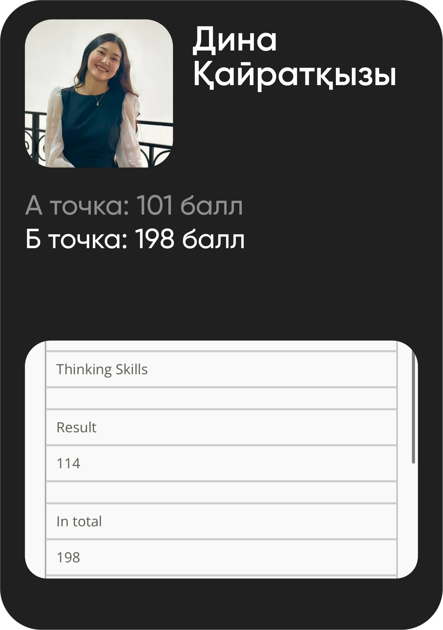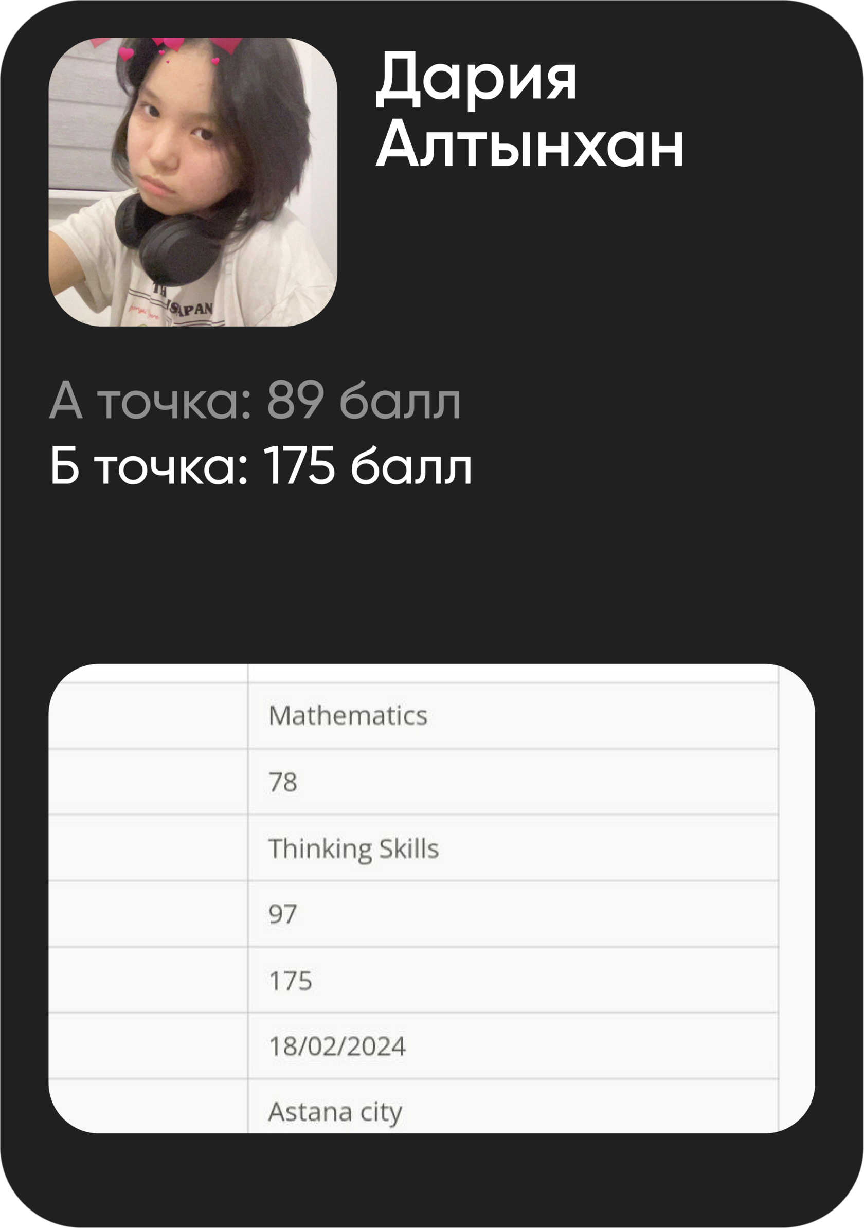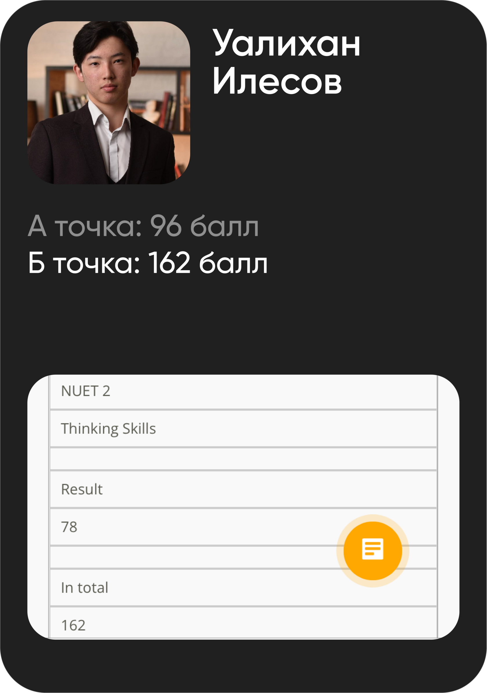 Главной ответственностью куратора является трекинг вашего прогресса во время курса. Связываясь с вами почти ежедневно, куратор следит за тем, чтобы вы посещали уроки, не забывали делать домашнее задание, пробные тесты. Куратор помогает при любых вопросах во время курса, от отставания по программе, до нехватки мотивации и сил. Наши кураторы это студенты младших курсов Назарбаев Университета, так как нам важно, чтобы куратор был не только требовательным, но также был другом наших учеников во время подготовки.