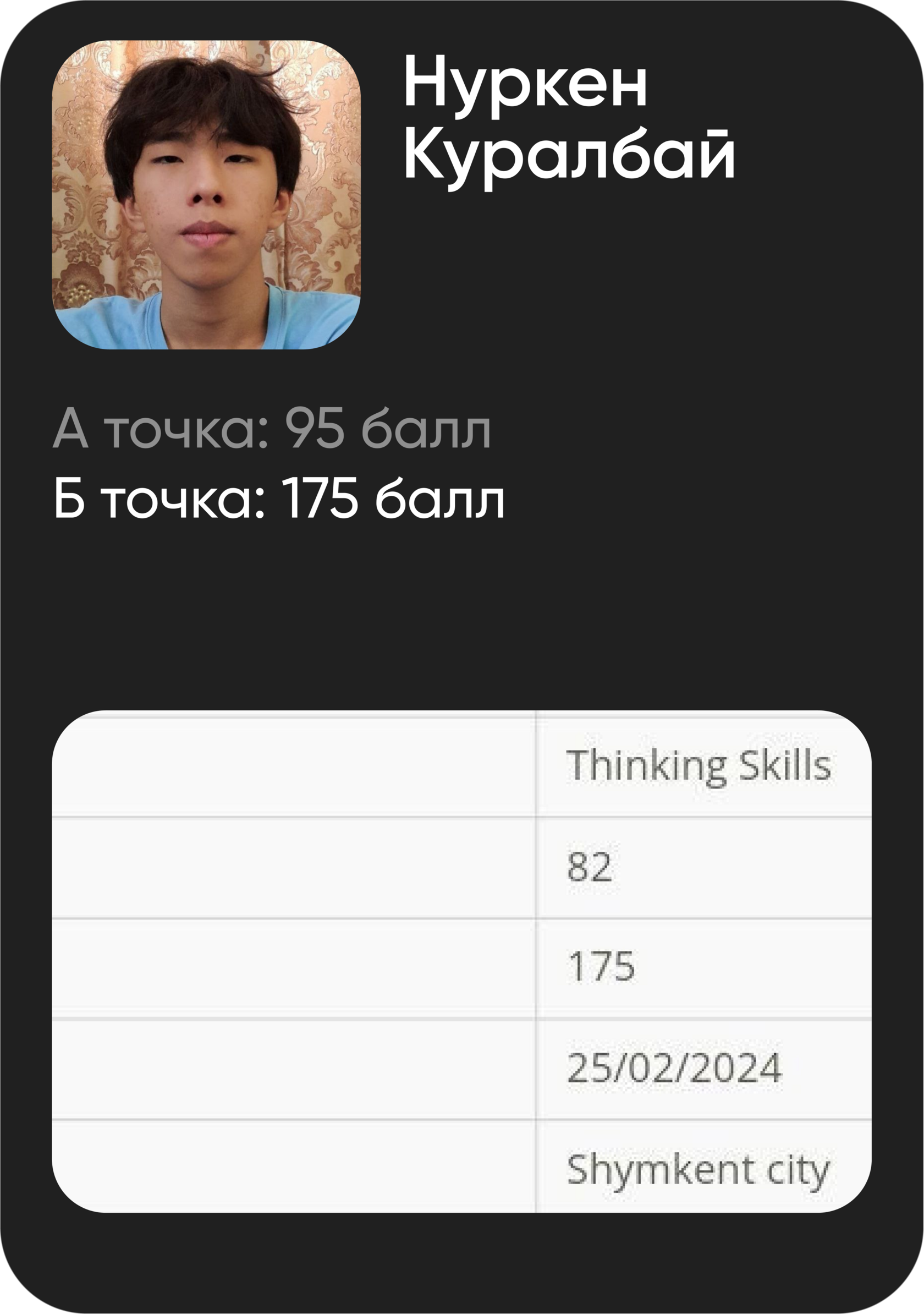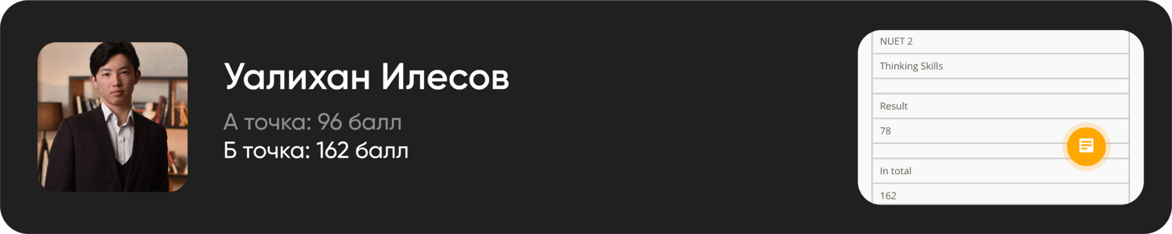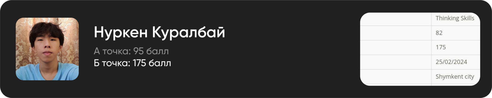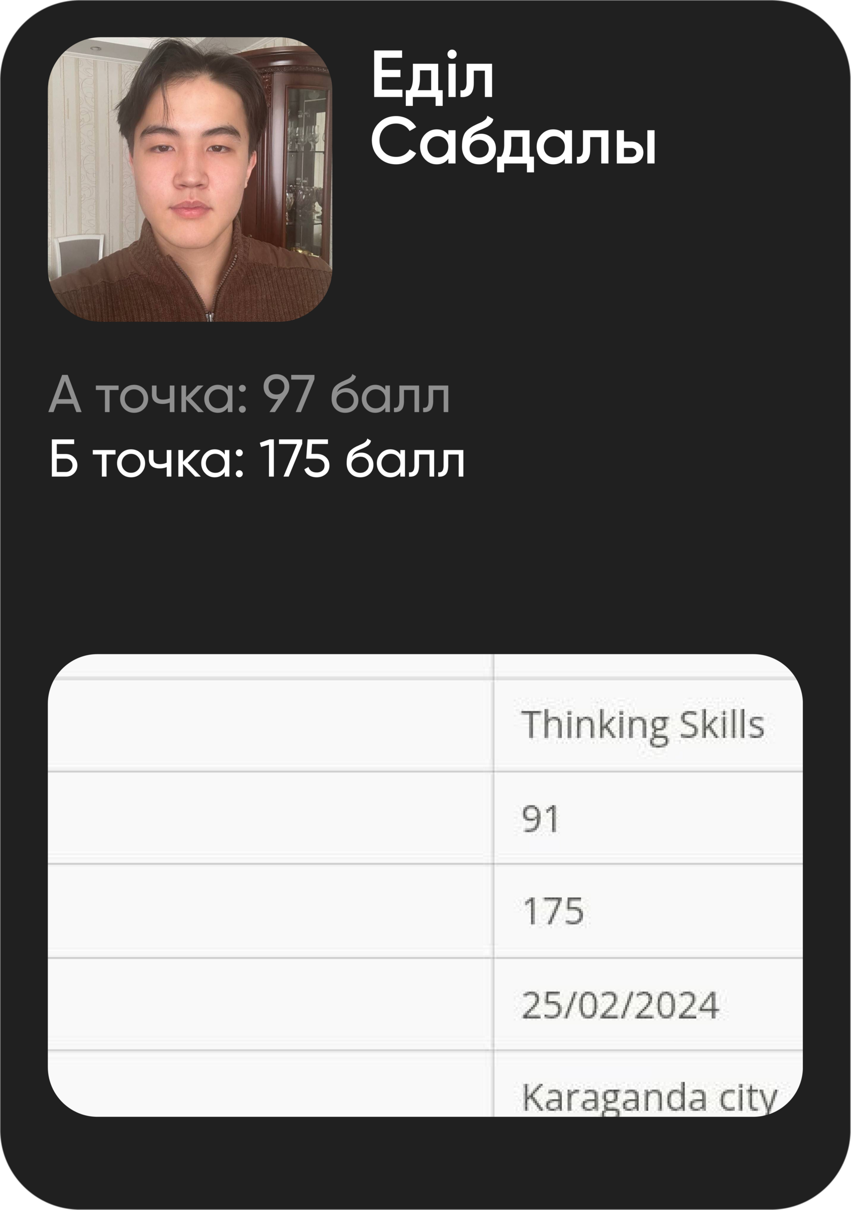 Главной ответственностью куратора является трекинг вашего прогресса во время курса. Связываясь с вами почти ежедневно, куратор следит за тем, чтобы вы посещали уроки, не забывали делать домашнее задание, пробные тесты. Куратор помогает при любых вопросах во время курса, от отставания по программе, до нехватки мотивации и сил. Наши кураторы это студенты младших курсов Назарбаев Университета, так как нам важно, чтобы куратор был не только требовательным, но также был другом наших учеников во время подготовки.