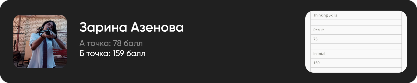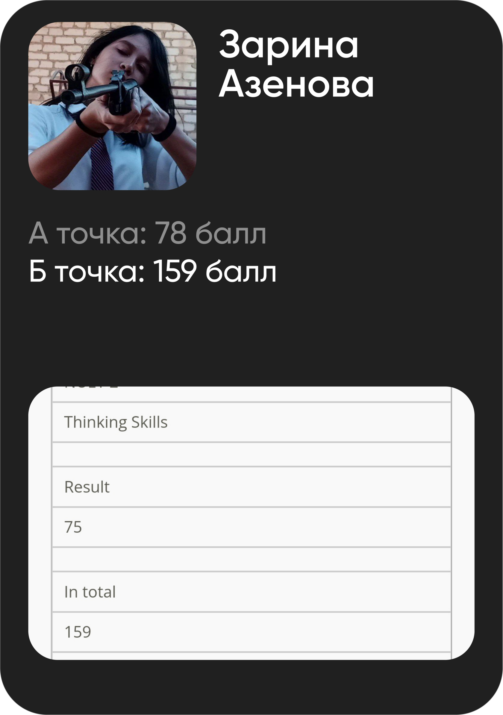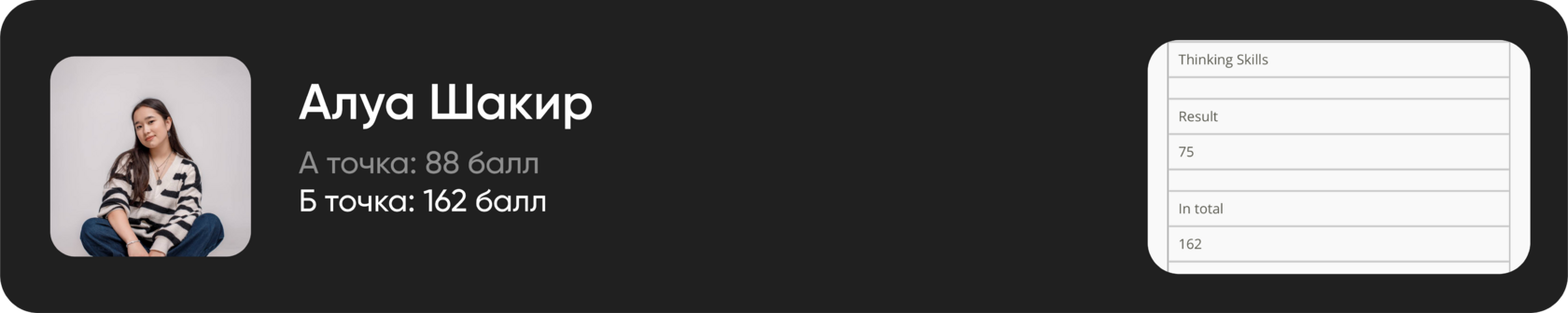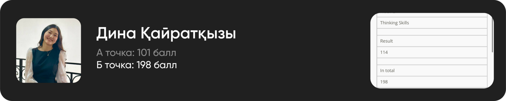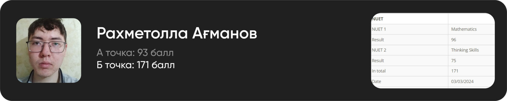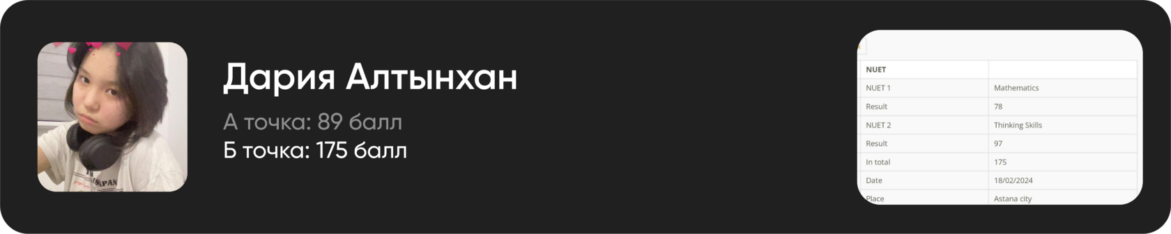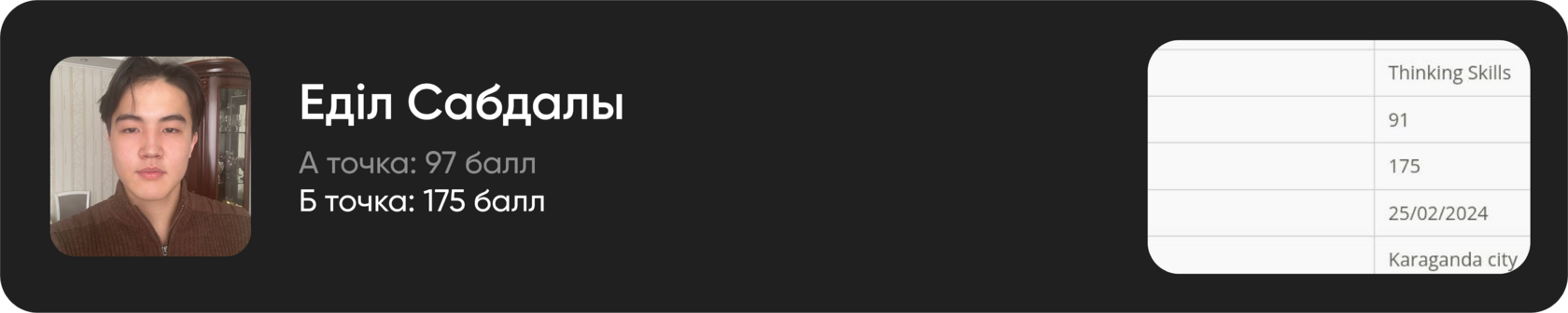Главной ответственностью куратора является трекинг вашего прогресса во время курса. Связываясь с вами почти ежедневно, куратор следит за тем, чтобы вы посещали уроки, не забывали делать домашнее задание, пробные тесты. Куратор помогает при любых вопросах во время курса, от отставания по программе, до нехватки мотивации и сил. Наши кураторы это студенты младших курсов Назарбаев Университета, так как нам важно, чтобы куратор был не только требовательным, но также был другом наших учеников во время подготовки.